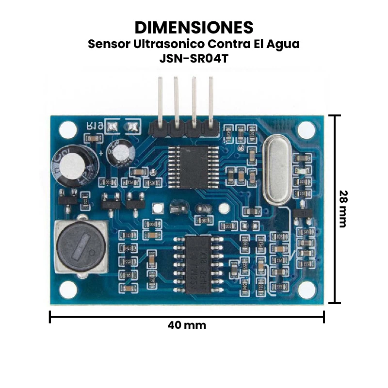 El sensor ultrasónico contra el agua JSN-SR04T se utiliza principalmente en aplicaciones de medición de distancia y detección de objetos en entornos exteriores o húmedos, como sistemas de control de nivel en tanques de agua, monitoreo de llenado en cisternas, automatización de riego, detección de obstáculos en robots para exteriores, medición de altura de líquidos y sistemas de estacionamiento vehicular. Gracias a su encapsulado impermeable, es ideal para condiciones con lluvia, salpicaduras o polvo. Es compatible con una amplia variedad de tarjetas de desarrollo que cuenten con pines de entrada/salida digitales, como Arduino (Uno, Nano, Mega, Pro Mini), ESP8266, ESP32, Raspberry Pi y otros microcontroladores con soporte para lectura de señales de pulso, lo que permite integrarlo fácilmente en proyectos de electrónica y automatización.