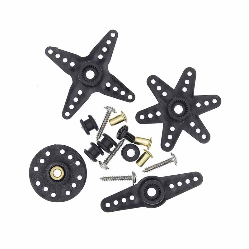 Estos servomotores puede rotar de 0° hasta 180°, su voltaje de operación va desde los 4.8 a 7.2 VDC. Cuenta con engranes de metal en su interior, también la flecha que incorpora es de metal, además incluye 3 brazos de plástico, 1 plato de sujeción, 5 tornillos de sujeción, 4 gomas y 4 coples.