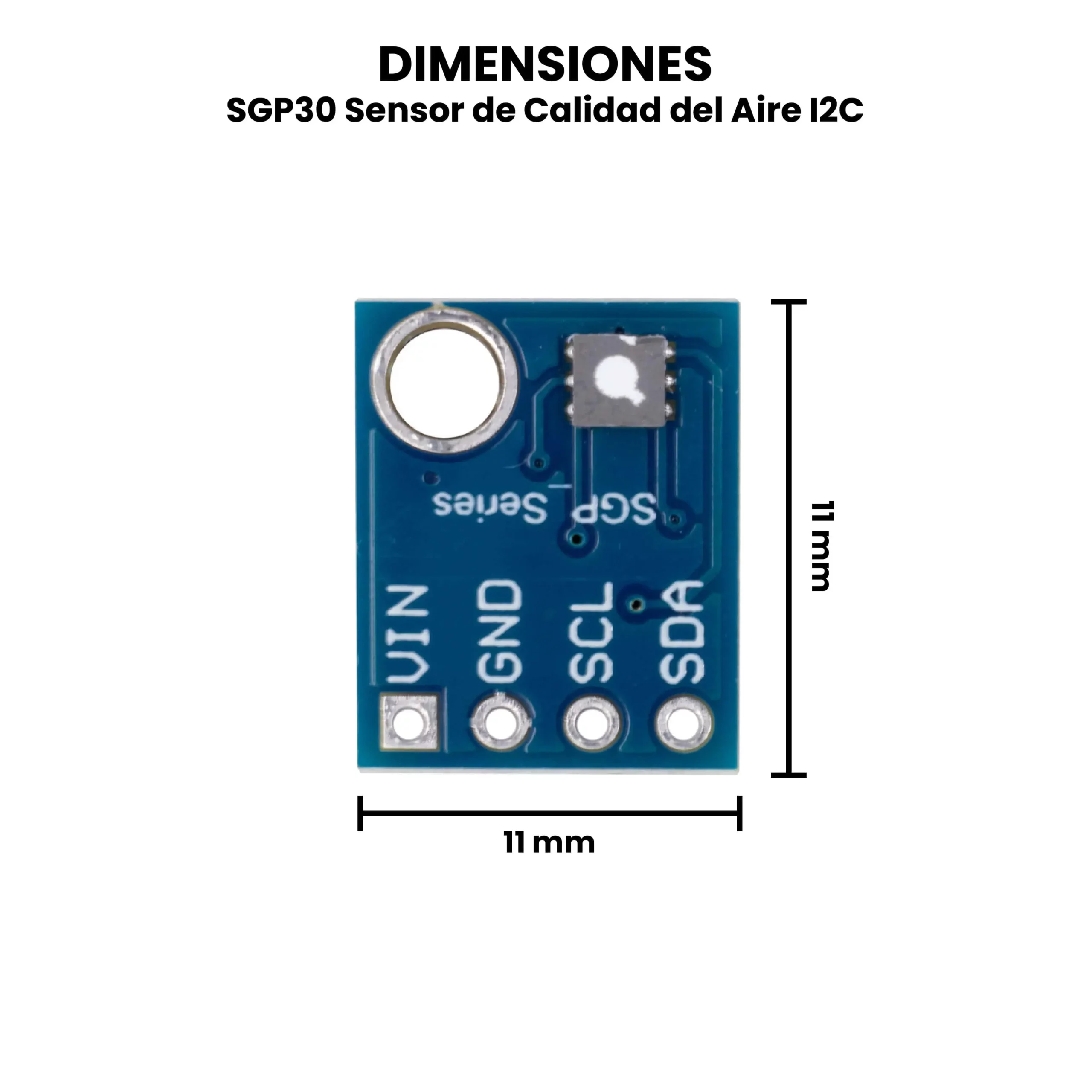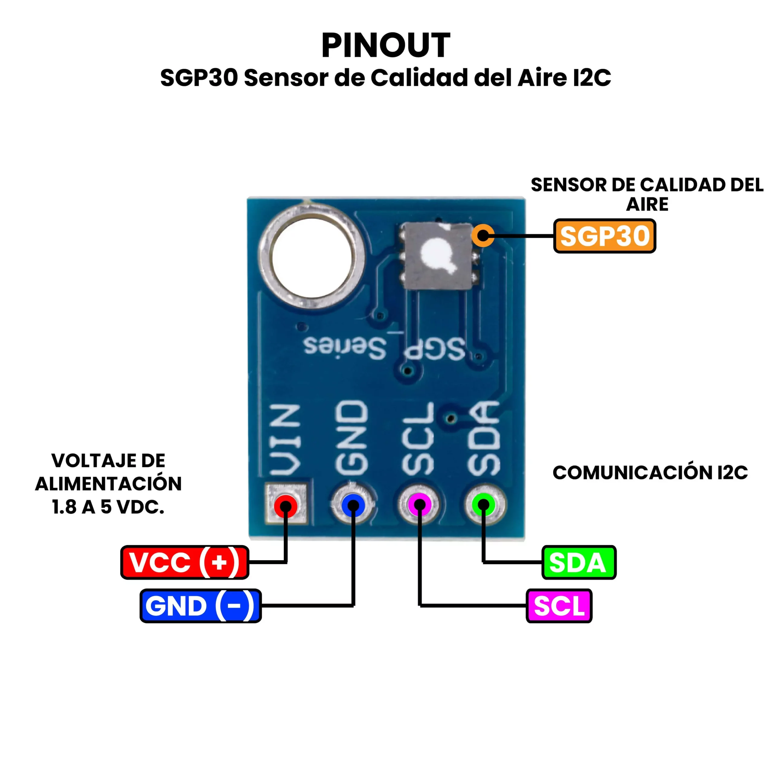 El SGP30 es un sensor digital de calidad del aire que utiliza tecnología de óxido metálico (MOX) para medir compuestos orgánicos volátiles (TVOC) y el equivalente de dióxido de carbono (eCO₂) en el ambiente. Funciona mediante una superficie sensible que cambia su resistencia al contacto con gases presentes en el aire; el chip interpreta estos cambios mediante algoritmos internos y genera lecturas precisas en tiempo real. Se comunica a través de I2C, lo que facilita su integración con microcontroladores.