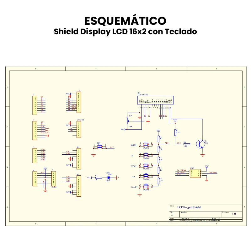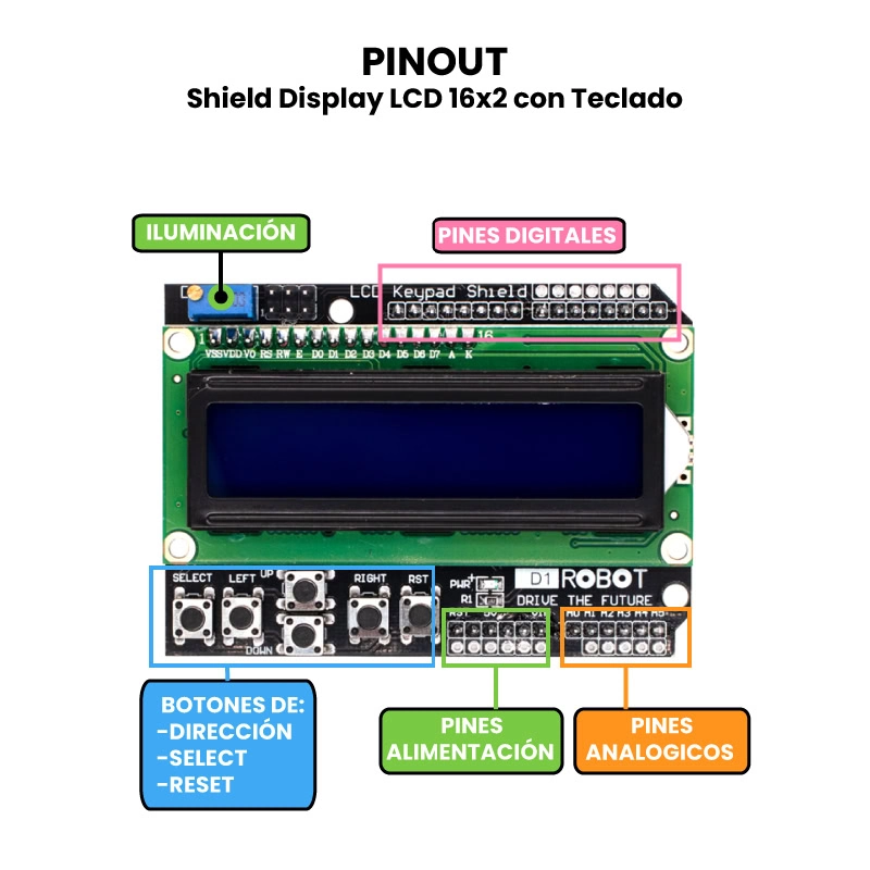 La Shield Display LCD 16×2 con Teclado es una placa de expansión, que combina una pantalla LCD de 16 caracteres por 2 líneas con un conjunto de 5 botones integrados (SELECT, LEFT, RIGHT, UP, DOWN) y un botón de RESET. Esta shield permite mostrar información en tiempo real y, al mismo tiempo, recibir entradas del usuario a través del teclado, todo en un solo módulo compacto. Funciona conectándose directamente sobre el Arduino, utilizando el bus I2C o paralelo (según el modelo) y el pin A0 para leer múltiples botones mediante divisores de voltaje, lo que simplifica el uso de pines digitales. Su funcionamiento consiste en mostrar datos, menús o mensajes en el LCD, mientras que los botones permiten navegar entre opciones, confirmar selecciones o ajustar parámetros, siendo ideal para crear interfaces de usuario simples en proyectos electrónicos o prototipos interactivos.