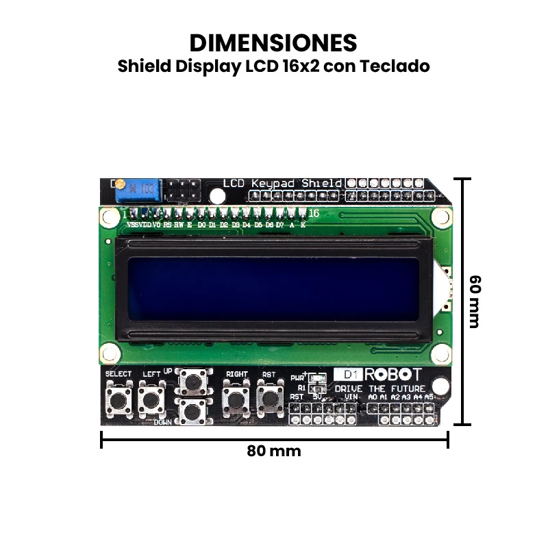 La Shield Display LCD 16×2 con Teclado es ampliamente utilizada en proyectos donde se requiere una interfaz visual y de control sencilla, ideal para sistemas embebidos, menús interactivos, monitores de sensores, cronómetros, configuradores de parámetros, entre otros. Su combinación de pantalla y botones facilita la creación de interfaces de usuario sin necesidad de componentes adicionales, lo que la hace perfecta para prototipos, paneles de control, estaciones meteorológicas, sistemas de riego automático, y proyectos educativos. Esta shield es totalmente compatible con placas Arduino como UNO, Mega 2560 y Leonardo, gracias a su diseño que encaja directamente sobre ellas. Aunque está optimizada para Arduino, también puede adaptarse a otros microcontroladores como ESP32 o STM32 mediante conexiones personalizadas, siempre que se respeten los pines y el protocolo de comunicación. Su integración simplificada y bajo costo la convierten en una herramienta muy útil tanto para principiantes como para desarrolladores experimentados.