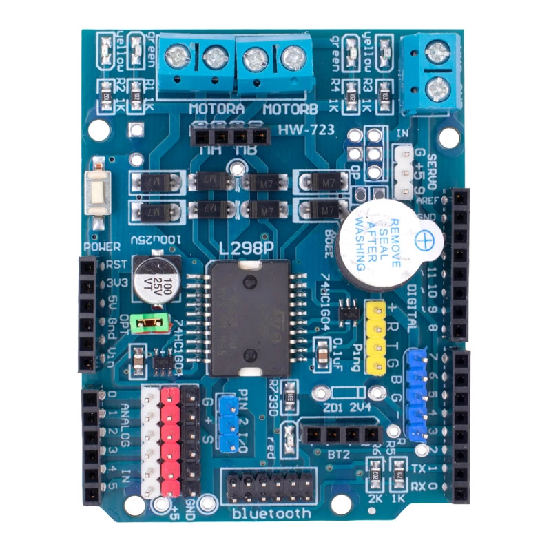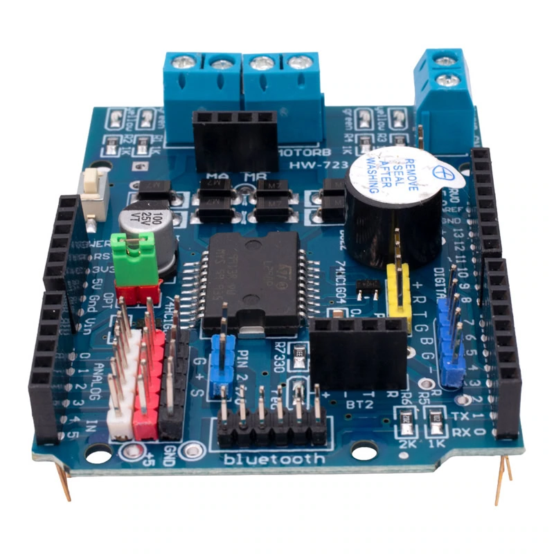 - Compatibilidad con Bluetooth: Equipado con conectores para módulos Bluetooth HC05 o HC06, lo que garantiza una comunicación inalámbrica flexible.