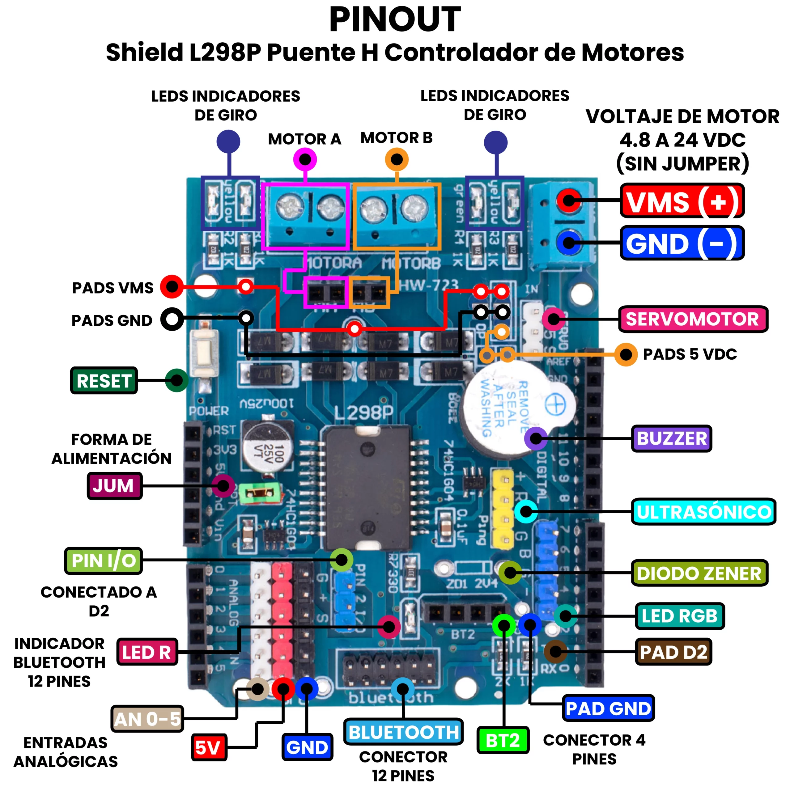 - Puente eliminado: Requiere alimentación independiente para Arduino, lo que evita conflictos de suministro eléctrico. (No se debe usar el conector de CC del Arduino).