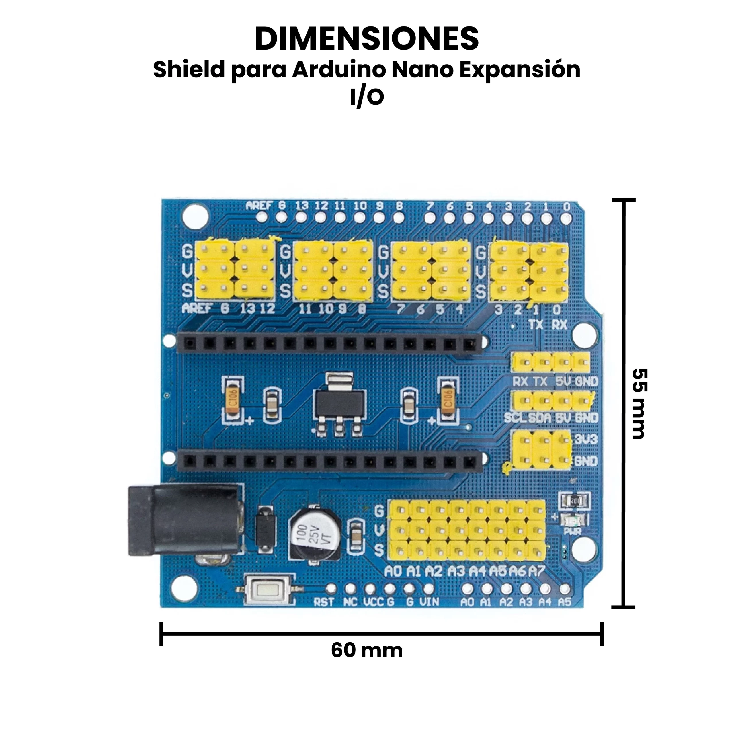 El Shield para Arduino Nano Expansion I/O es una placa de expansión diseñada para facilitar la conexión de sensores, módulos, actuadores al Arduino Nano, organizando y ampliando sus pines de entrada y salida en conectores más accesibles. Consiste en replicar todos los pines digitales y analógicos del Arduino Nano en terminales claramente distribuidas, generalmente con formato de tres pines (VCC, GND y señal), lo que permite conectar dispositivos sin necesidad de realizar cableados complejos o protoboards adicionales, pudiendo ser alimentado con 12 VDC.