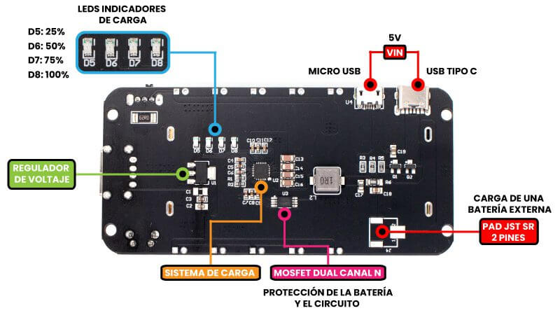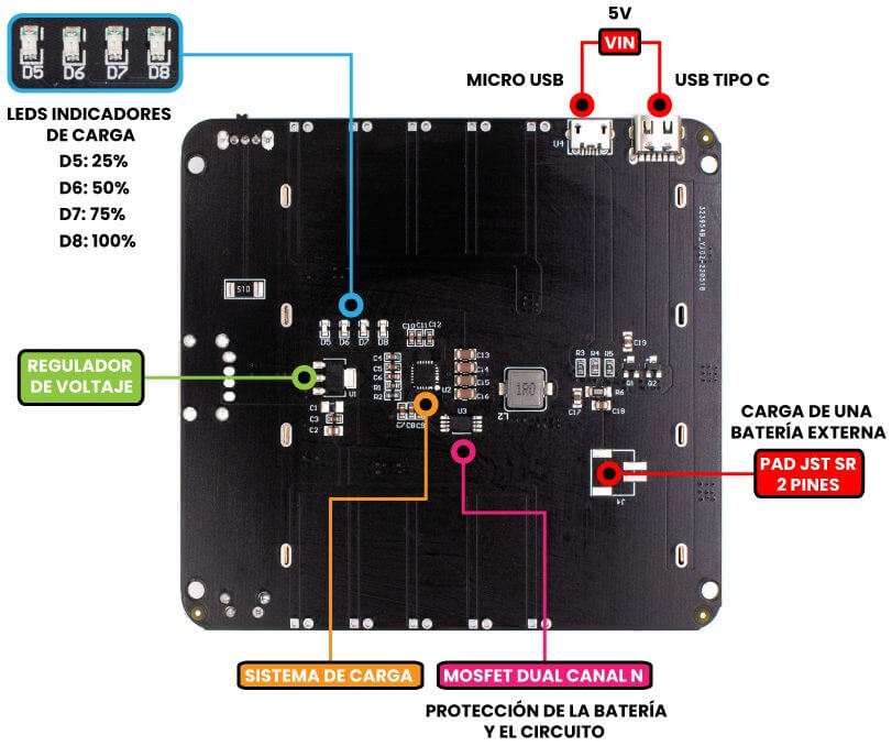 - Sistema: Incorpora un circuito de carga (4056E) con protección de batería (DW01V y 8205A), un convertidor Boost DC-DC, (FP6238) y reguladores de voltaje para alimentar placas electrónicas ya sea mediante los pines de voltaje de salida a 3.3V, 5V y mediante el conector USB.
