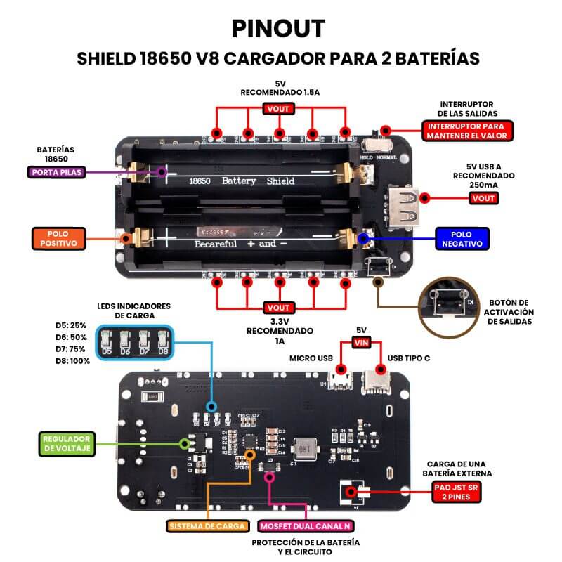 Los módulos 18650 Shield V3, V8 y V9 también conocidos como porta batería de tipo cilíndrica 18650 permite la alimentación de circuitos y correcta carga de baterías 18650, el voltaje de entrada debe de ser de 5V a una corriente de entre 600 a 800 mA.