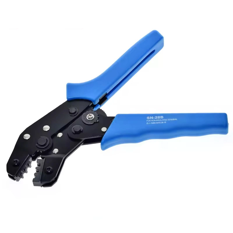 La SN-28B Pinza Dupont Crimper es una herramienta de crimpado de alta precisión diseñada para terminales tipo barril abierto (open barrel) utilizados en conectores Dupont y series compatibles. Su sistema de matraca con liberación automática permite un engaste uniforme y repetible, evitando falsos contactos y logrando conexiones eléctricas firmes sin necesidad de soldadura. Sus cavidades de crimpado están calibrados de fábrica para trabajar con conductores de 0.08 a 1.0 mm² (28-18 AWG), permitiendo crimpar simultáneamente el núcleo del cable y el aislamiento en una sola operación para un acabado profesional.