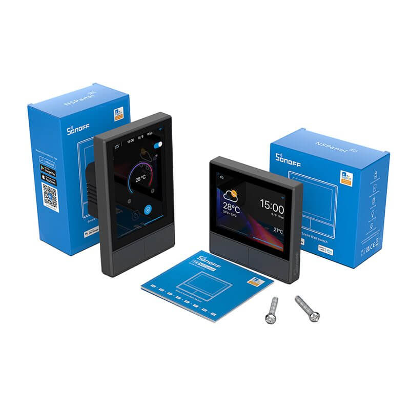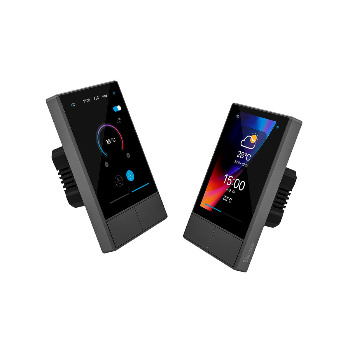 Sonoff NSPanel Touch, disponible en versión Europea EU cuadrado y americano US rectangular, son paneles táctiles capacitivos que incorporan conectividad vía WiFi 2.4GHz y Bluetooth 4.2, ideales para cambiar tus viejos interruptores de pared, para tener un hogar u oficina inteligente. Pueden controlar gran variedad de dispositivos inteligentes Sonoff así como electrodomésticos, calentadores, refrigeradores, cortinas, puertas y ventanas de forma centralizada mediante el mismo panel NSPanel de forma táctil o a través de la App de eWelink. Desde el NSPanel-US podrá configurar escenarios desde los cuales podrá crear configuraciones de actuación a su medida.