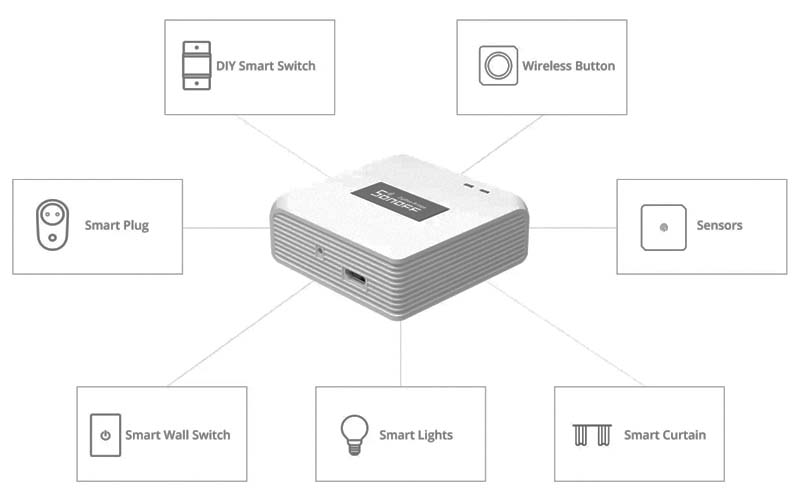 El Sonoff Zigbee Bridge te permite crear escenas inteligentes para hacer que los dispositivos inteligentes Wi-Fi y ZigBee se comuniquen para acceder a un hogar más inteligente y controlarlos a todos con la aplicación eWeLink. Puede soportar un máximo de 32 subdispositivos conectados que son interruptores, enchufes y sensores de seguridad basados en ZigBee. Los cuales están diseñados para conectarse al Sonoff Zigbee Bridge.
