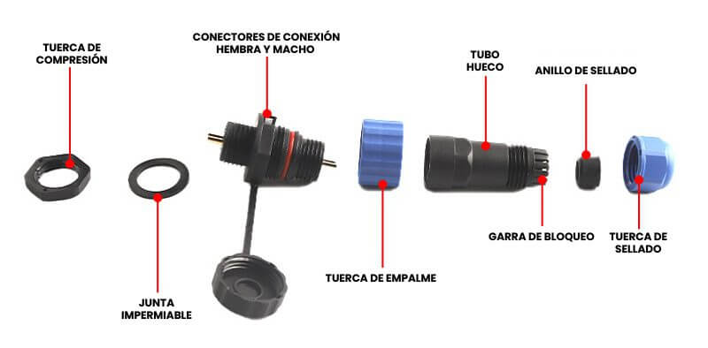 Los SP16 conectores de aviación, con enchufe macho y tuerca de fijación trasera hembra, es un conector eléctrico impermeable que ofrece protección contra agua y polvo, ideal para entornos exigentes. Disponibles en configuraciones de 2, 3, 4, 5 y 6 pines, estos conectores son compactos y cuentan con enchufe de cable macho recto y tuerca de fijación hembra para su montaje en carcasas. Cada conector SP16 incluye tapones de sellado con certificación IP68, para conexiones seguras y resistentes.