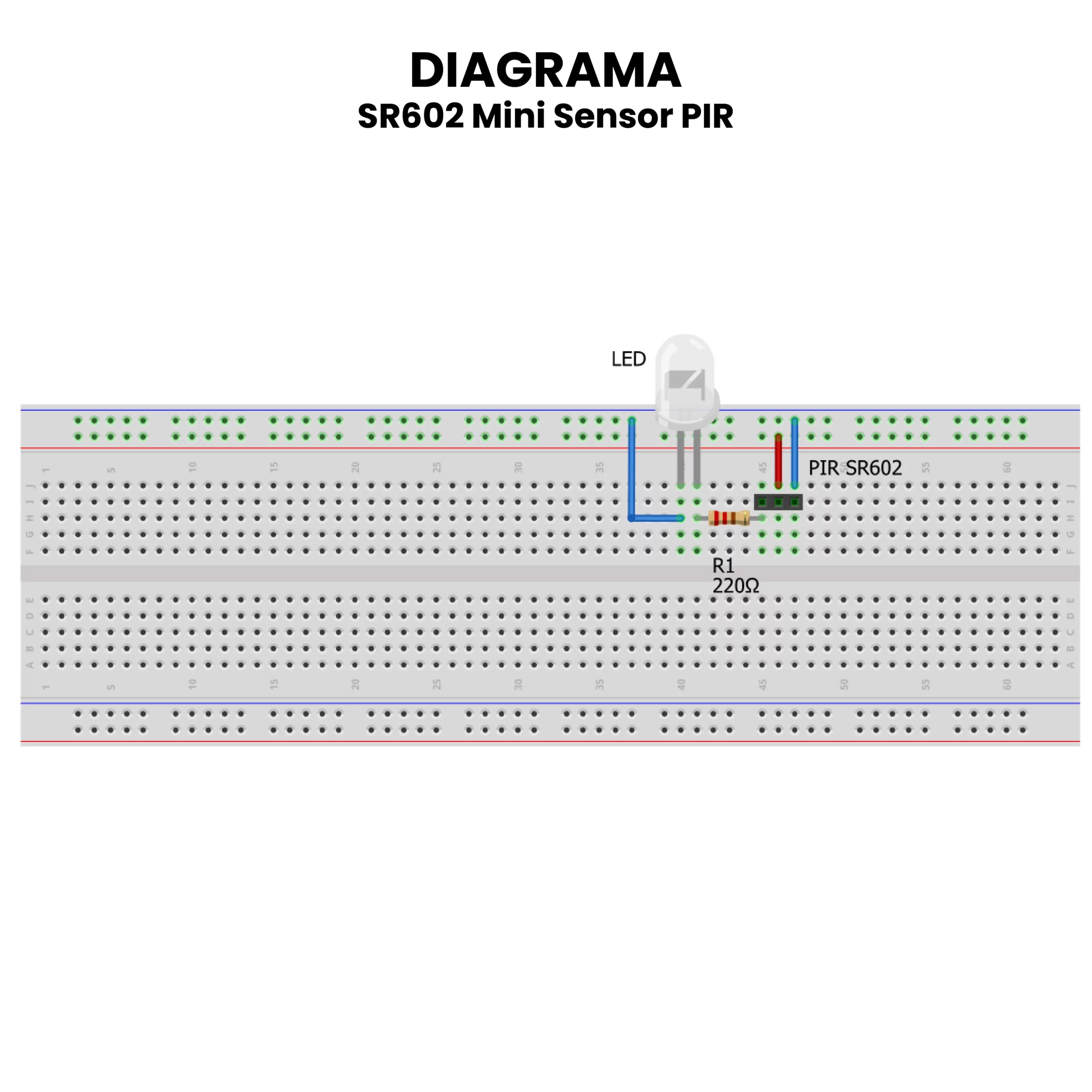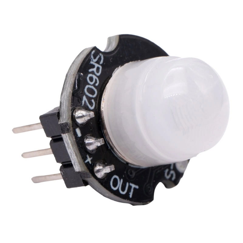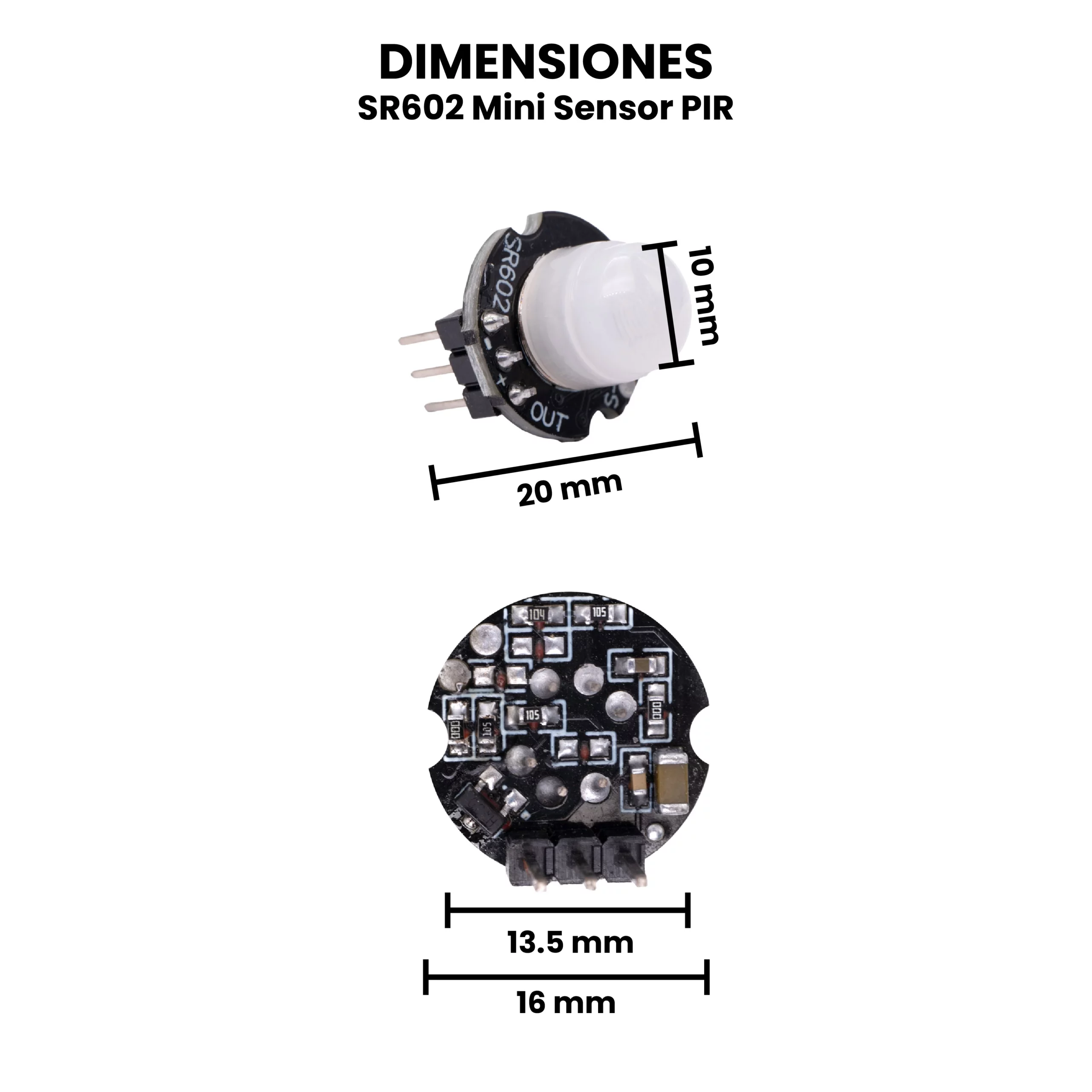 El SR602 Mini Sensor PIR es un sensor infrarrojo pasivo de tamaño compacto diseñado para detectar movimiento de personas o animales mediante la variación de la radiación infrarroja emitida por los cuerpos. Este sensor identifica cambios en el calor del entorno cuando un objeto en movimiento pasa frente al sensor; esta señal es procesada por un circuito interno de amplificación y comparación, generando una salida digital en nivel alto durante un tiempo determinado.