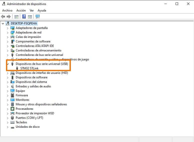 - Verificar nuevamente en administrador de dispositivos el estado del controlador y si aparece como se muestra en la imagen ya está listo STLINK.