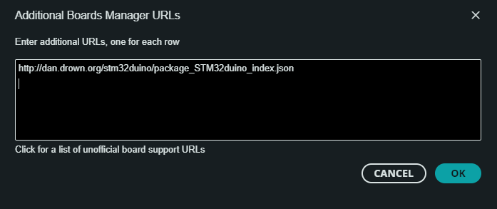 1.- Copia y pega el siguiente link en la ventana de preferencias (File —> Preferences) en el apartado llamado “Additional boards manager URLs:” de tu Arduino IDE http://dan.drown.org/stm32duino/package_STM32duino_index.json