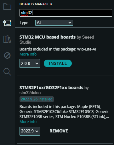 2.- Dirígete al “Boards manager” (Ubicado en la barra vertical a la izquierda del IDE), busca e instala las tarjetas STM32F1xx/GD32F1xx boards