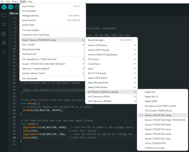 3.- Selecciona la tarjeta Generic STM32F103 series como se muestra en la imagen