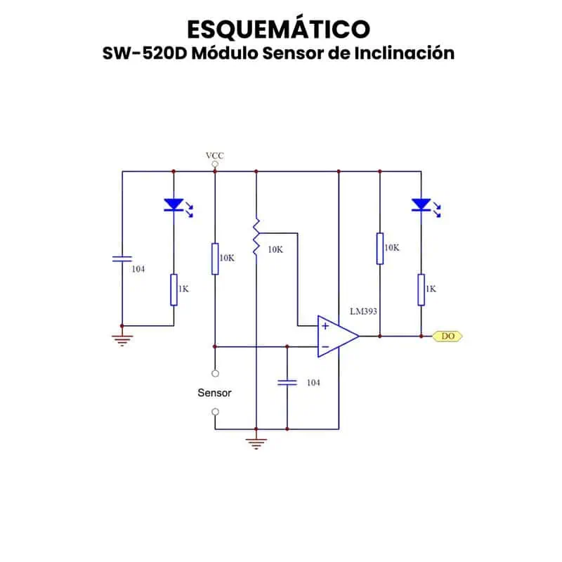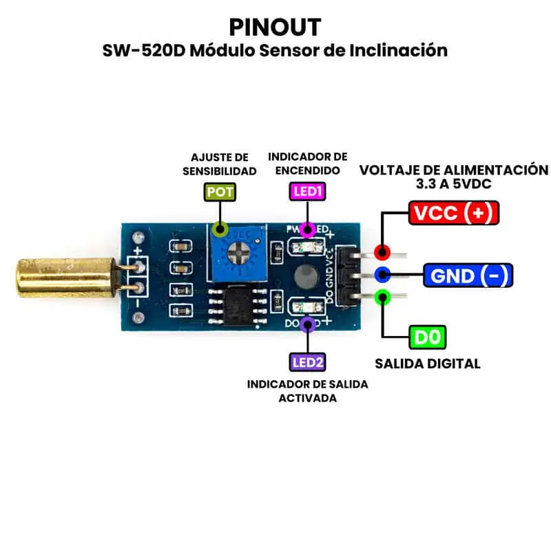 El SW-520D Módulo Sensor de Inclinación es un dispositivo electrónico diseñado para detectar cambios en la posición o inclinación de un objeto. Su funcionamiento se basa en un interruptor de bola metálica alojado dentro del sensor, el cual cierra o abre el circuito según el ángulo en que se encuentre. Cuando el módulo se inclina o se mueve, la bola metálica se desplaza y establece o interrumpe el contacto eléctrico, generando una señal que el circuito comparador (generalmente un LM393) interpreta como una salida digital. Este comportamiento permite detectar si un dispositivo está vertical, inclinado o en movimiento, y el módulo incluye además un potenciómetro para ajustar la sensibilidad, junto con un LED indicador que se enciende al detectar inclinación.