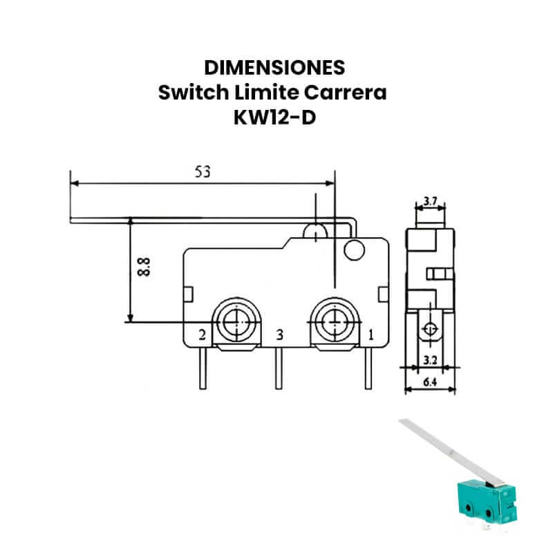 El Switch Limite Carrera KW12 o sensor de contacto disponibles en los modelos B,C,D y N son dispositivos electromecánicos situados al final del recorrido o de un elemento móvil con el objetivo de enviar señales que puedan modificar el estado de un circuito. La salida de los finales de carrera es binaria y la única información que nos da, es si el objeto está en una posición determinada o no. Son funcionales máximo para 250V y corriente de 5A.