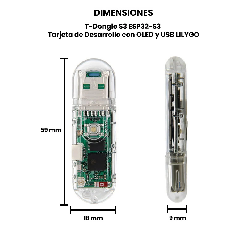 El T-Dongle S3 es una tarjeta de desarrollo ultra compacta basada en el microcontrolador ESP32-S3, diseñada para aplicaciones de IoT, pruebas rápidas y dispositivos USB inteligentes. Integra conectividad WiFi y Bluetooth Low Energy, una pantalla LCD para la visualización de información en tiempo real y una interfaz USB directa, lo que permite alimentación, programación y comunicación sin necesidad de hardware adicional.