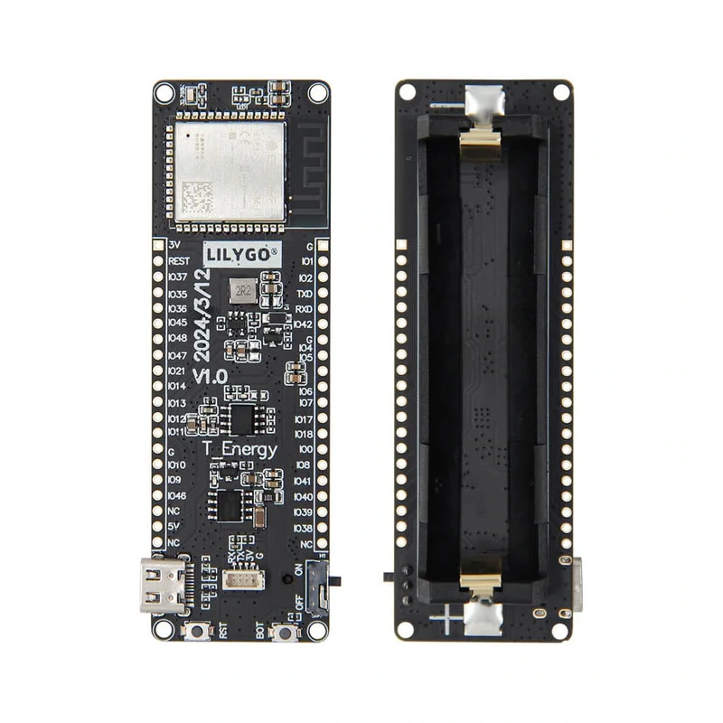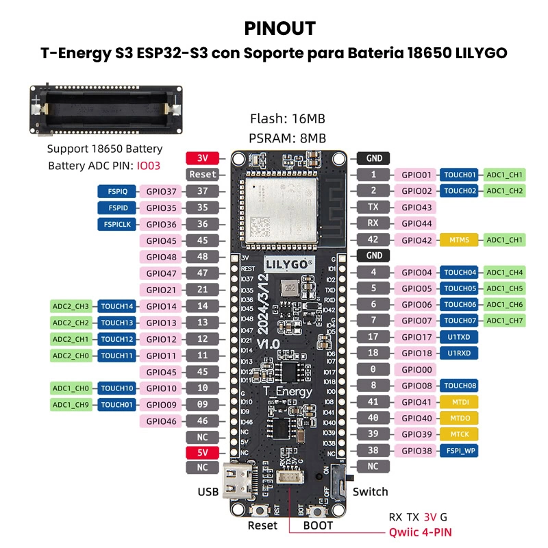 La T-ENERGY S3 es una placa de desarrollo compacta basada en el microcontrolador ESP32-S3, diseñada para aplicaciones embebidas que requieren conectividad inalámbrica mediante Wi-Fi y Bluetooth, así como operación autónoma mediante batería tipo 18650. Integra un sistema de gestión de energía optimizado para alimentación por batería, un conector USB para programación, y expone múltiples GPIOs del ESP32-S3 para la conexión de sensores, actuadores y periféricos externos.