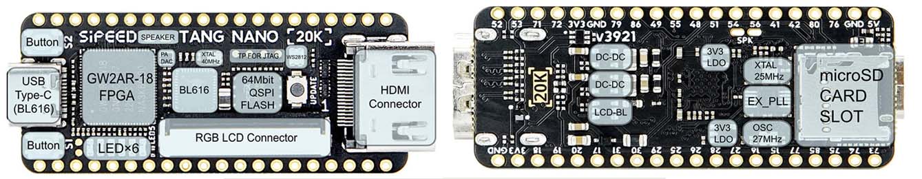 - Potente rendimiento: la placa de desarrollo Sipeed Tang Nano 20K FPGA está equipada con un procesador RISC-V,de 32 bits y 48 MHz (firmware Litex) que se ejecuta en el FPGA y arranca en Linux.