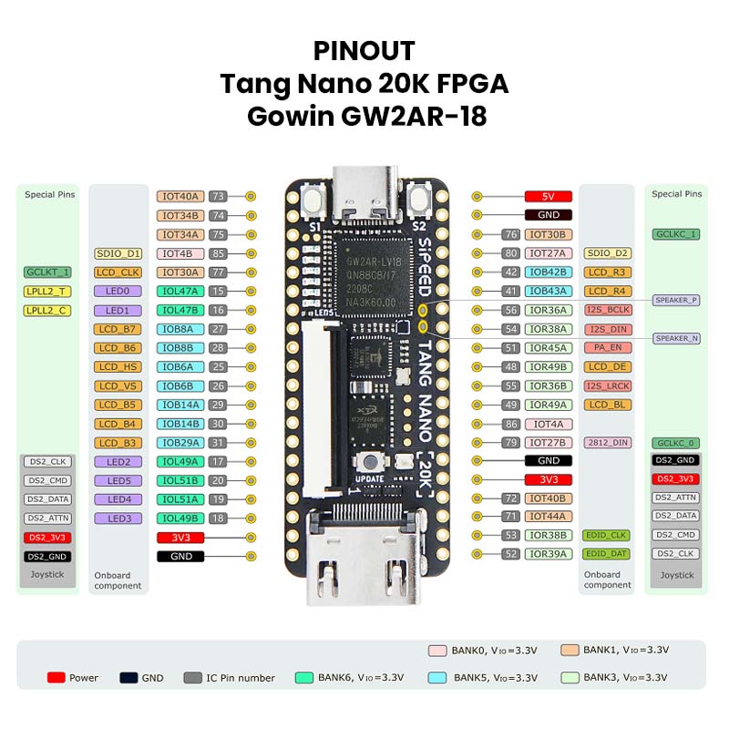 Tang nano 20K está equipado con chip BL616, que proporciona la funciones JTAG para FPGA , USB a UART para FPGA, USB a SPI para FPGA para GW2AR-18. Los usuarios solo necesitan utilizar el cable usb-c para conectar la placa de desarrollo con la computadora para completar la descarga Ideal para el diseños lógicos FPGA , también se puede utilizar para softcores risc-v de 32 sobre Linux o jugando juegos retro emulador.