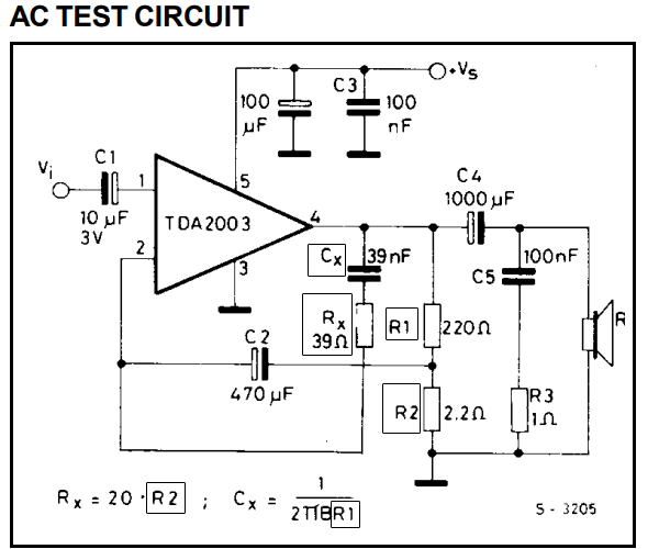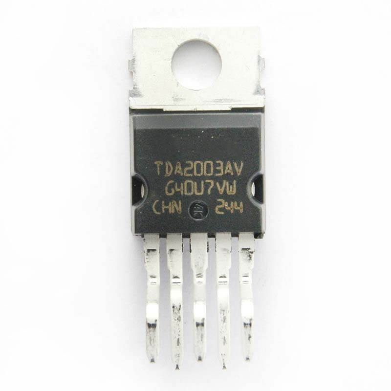 El amplificador de audio TDA2003A es un amplificador de clase AB de 10 watts proporciona una capacidad de corriente de salida alta (hasta 3.5 A) con muy baja distorsión de armónico. Se garantiza una operación completamente segura debido a la protección contra el cortocircuito de CC y CA entre todas las clavijas y tierra, sobre-rango térmico, descarga de carga, subida de voltaje hasta 40V.