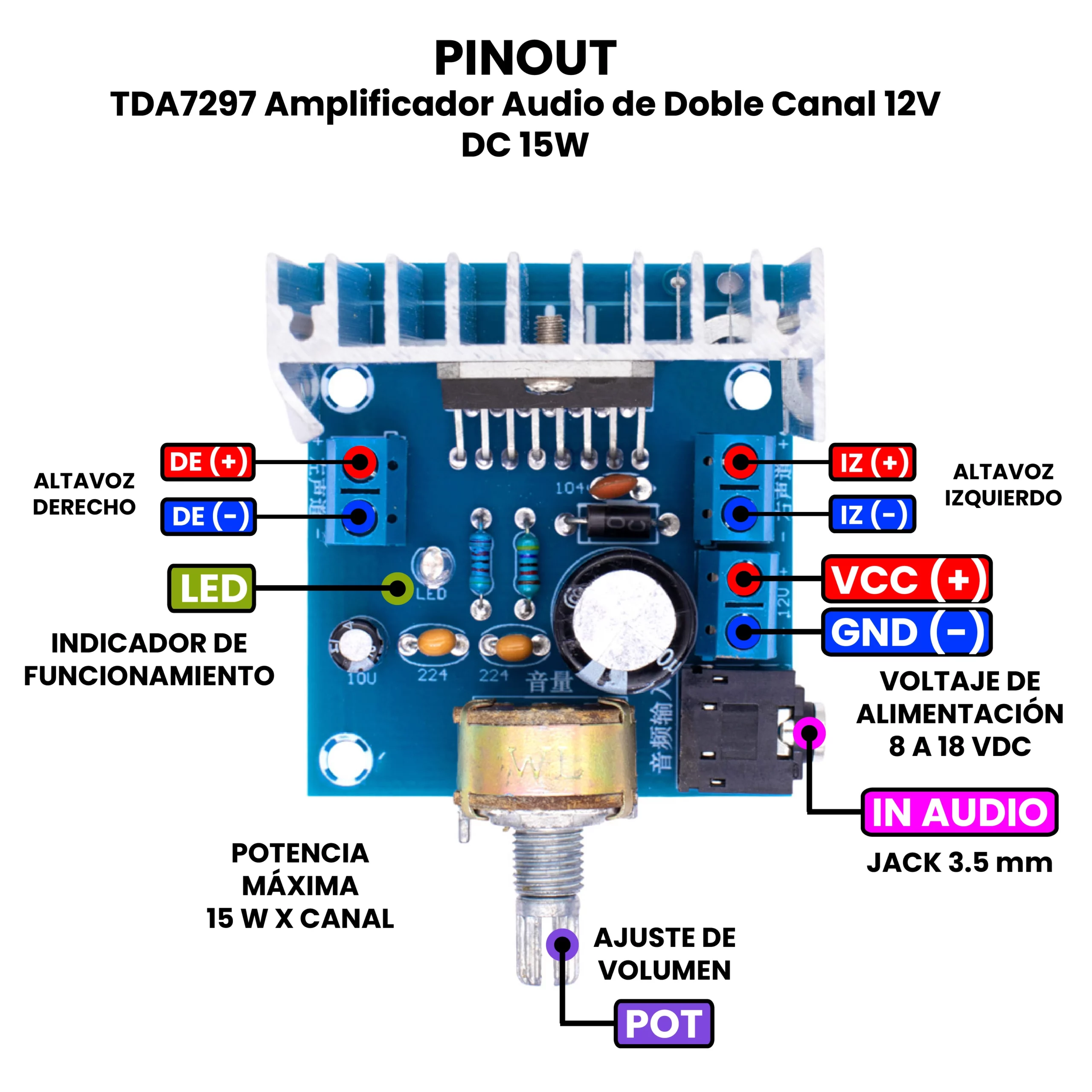 El TDA7297 Amplificador de Audio de Doble Canal 12V DC 15W es un módulo amplificador estéreo basado en el circuito integrado TDA7297, diseñado para amplificar señales de audio de bajo nivel, y entregar potencia suficiente para mover bocinas pasivas. Se alimenta con una fuente de 12 V DC, donde la señal de audio de entrada es procesada internamente mediante amplificación en clase AB, proporcionando una salida de hasta 15 W por canal. Incluye: 1x Perilla y 1x Tuerca para el potenciómetro.