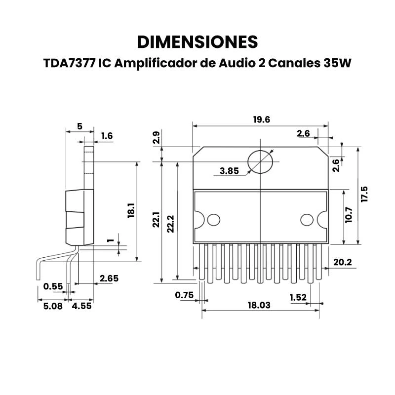 - Tipo: Amplificador de audio clase AB, tecnología CMOS.