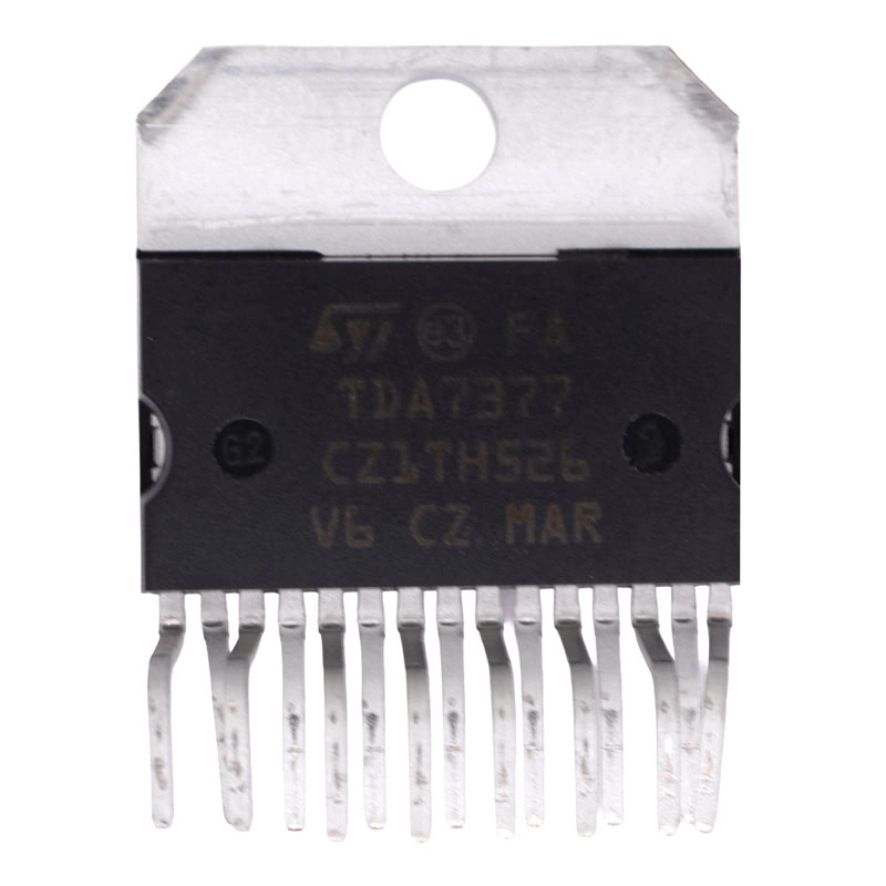 El TDA7377 es un circuito integrado amplificador de potencia de audio Clase AB muy popular, diseñado principalmente para sistemas de audio de coche, pero también usado en proyectos DIY, capaz de configurarse como doble puente (2 canales) o cuádruple de un solo extremo (4 canales), entregando hasta unos 30 W por canal en configuraciones puenteadas (2.1), ideal para sistemas de sonido en casa o en vehículos, con pocas piezas externas y funciones de diagnóstico.