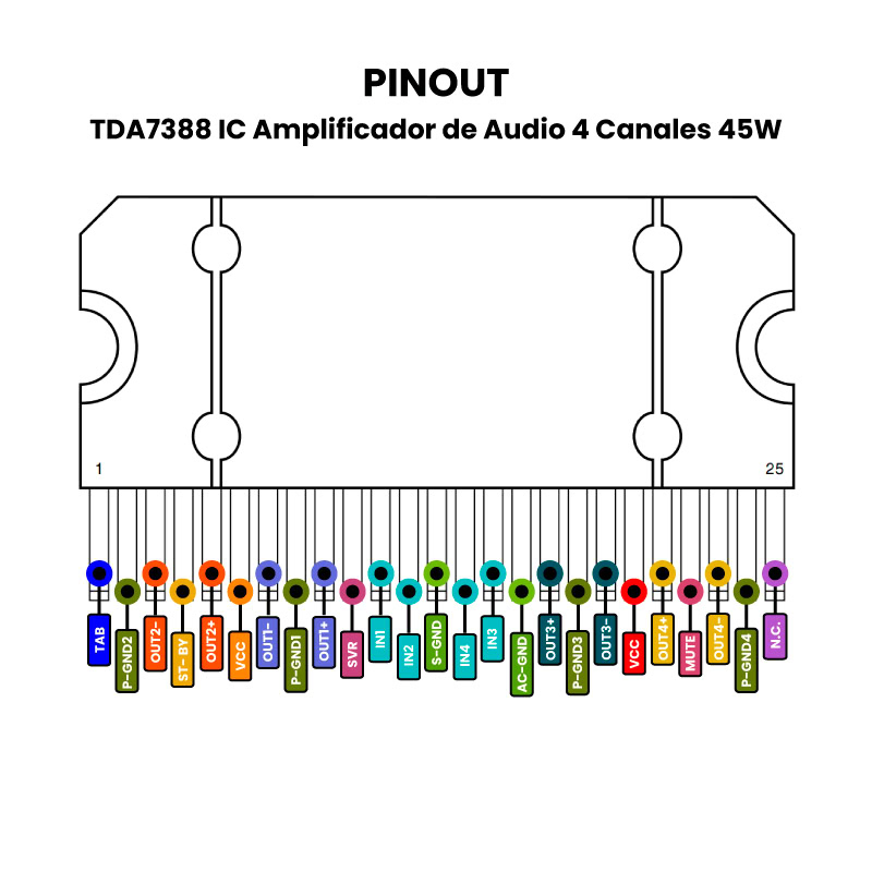 - Salida de Audio: La señal amplificada sale por los pines de salida (L, R, L2, R2) y se conecta a los altavoces, pudiendo manejar hasta 4 altavoces.