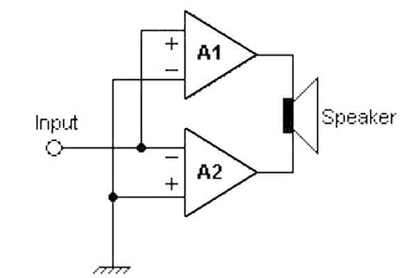 Un amplificador en modo puente ve una impedancia que es la mitad de la impedancia del altavoz. Por ejemplo; si el altavoz es de 8 y amplificador lo interpreta de 4.