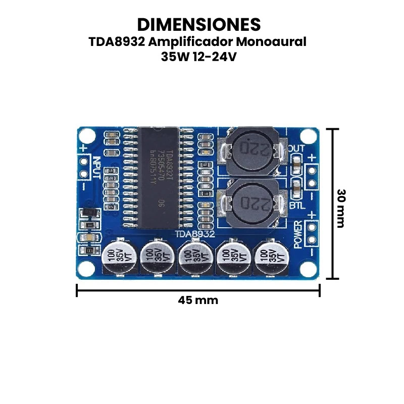 El TDA8932 es un amplificador de audio monoaural de clase D que puede entregar hasta 30W de potencia de salida a una carga de 8 ohmios y 17W de potencia de salida a una carga de 4 ohmios, operando con una fuente de alimentación entre 12V y 24V DC. Este módulo está basado en el circuito integrado TDA8932 de NXP, el cual utiliza tecnología de conmutación de alta eficiencia para amplificar señales de audio con bajo consumo energético y mínima generación de calor, lo que lo hace ideal para aplicaciones compactas y portátiles. Su funcionamiento consiste en recibir una señal de audio de baja potencia (como la salida de un reproductor o microcontrolador) y amplificarla mediante modulación por ancho de pulso (PWM) para alimentar directamente un altavoz. Además, incluye protección contra sobrecalentamiento, cortocircuitos y sobrevoltaje, lo que mejora su durabilidad.