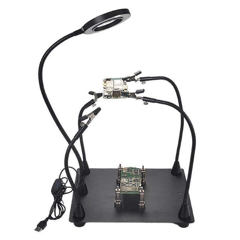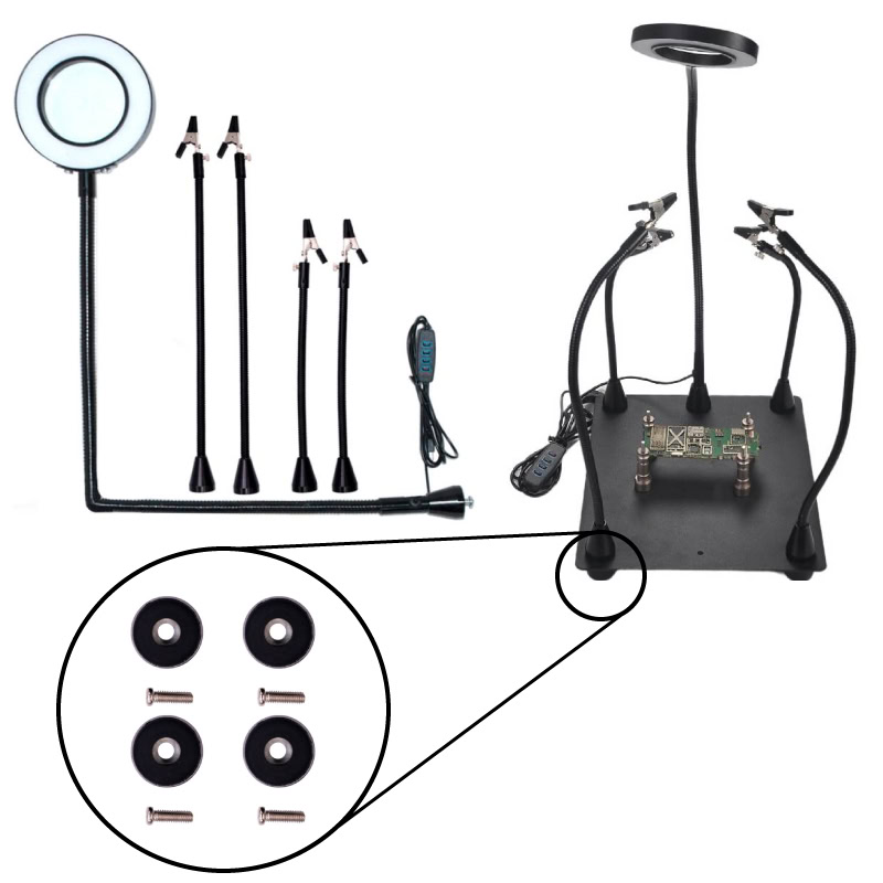 - Las bases metálicas con goma atornillables están diseñadas para fijarse a una estructura metálica más grande, proporcionando una plataforma robusta para sujetar los 4 brazos con pinzas y el brazo con lupa y lámpara. La base metálica garantiza estabilidad, mientras que la goma antideslizante protege la superficie de trabajo. Al atornillarse a la base principal, los brazos quedan firmemente asegurados, lo que permite realizar trabajos de precisión, como soldaduras o inspecciones electrónicas, con mayor control y seguridad.