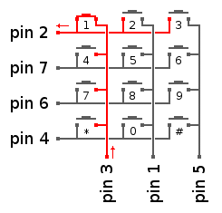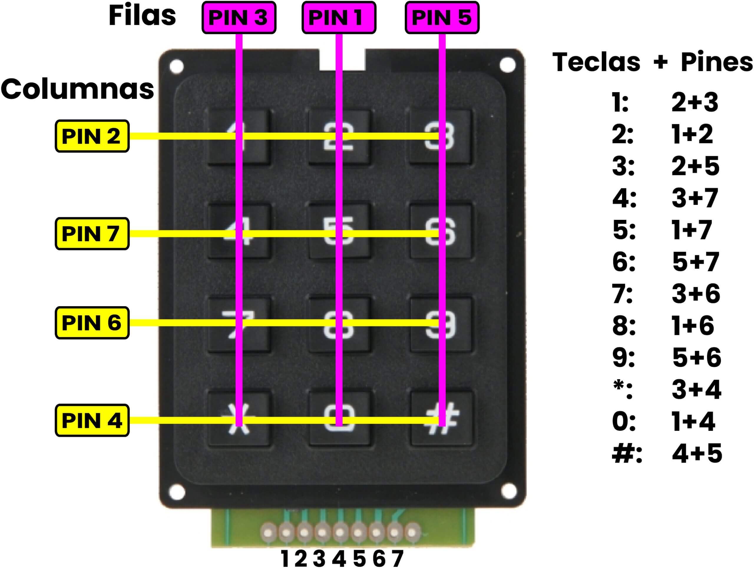 En resumen, los teclados matriciales usan una combinación de filas y columnas para conocer el estado de los botones. Cada tecla es un pulsador conectado a una fila y a una columna. Cuando se pulsa una de las teclas, se cierra una conexión única entre una fila y una columna.