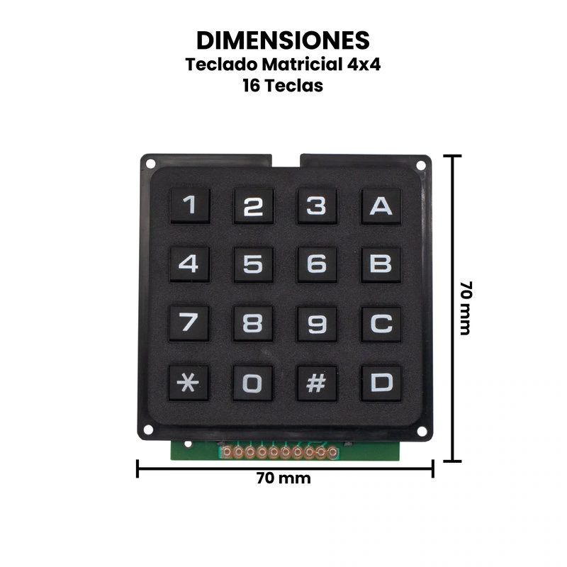 El Teclado Matricial Rígido de 12/16 Teclas es un dispositivo de entrada diseñado para facilitar la interacción entre el usuario y sistemas electrónicos, se basa en una matriz de filas y columnas, donde cada tecla está ubicada en la intersección de una fila con una columna; al presionar una tecla se cierra el circuito correspondiente, lo que permite identificar de manera única cuál fue la tecla activada. Este tipo de teclado rígido se caracteriza por su resistencia mecánica, durabilidad y facilidad de conexión.