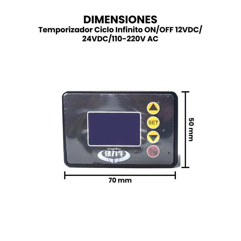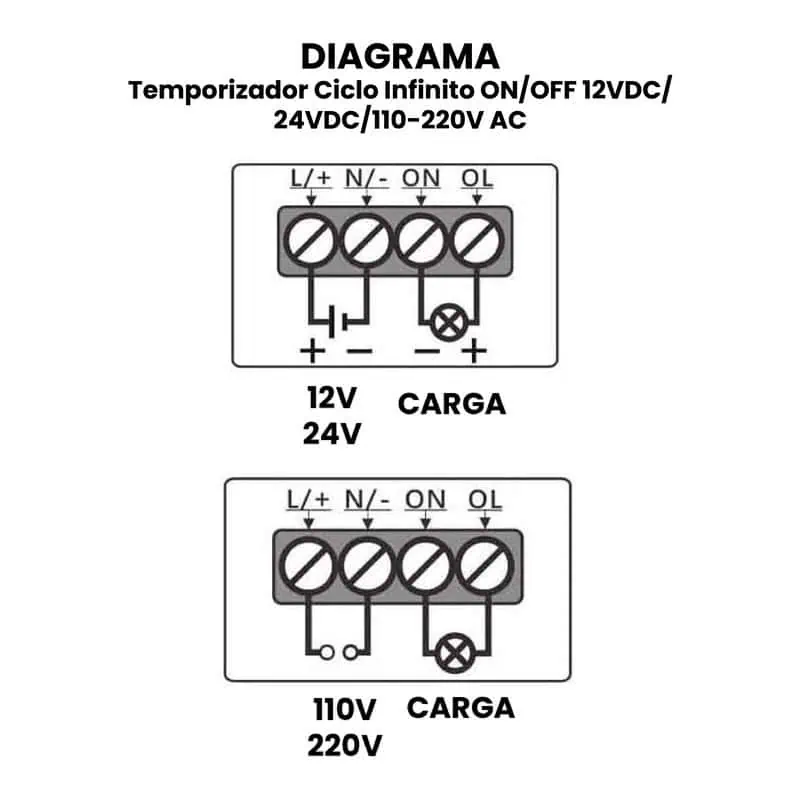 El Temporizador Ciclo Infinito ON/OFF 12VDC/24VDC/110-220V AC es un dispositivo electrónico programable que permite automatizar el encendido y apagado repetitivo de equipos eléctricos o electrónicos en intervalos definidos por el usuario. Su funcionamiento se basa en un control de tiempos ajustables, donde se configura un periodo de encendido (ON) y un periodo de apagado (OFF), repitiéndose de manera continua en un ciclo infinito mientras el dispositivo esté alimentado. Puede trabajar con distintas tensiones de entrada, ya sea en corriente continua (12V o 24V DC) o en corriente alterna (110-220V AC)