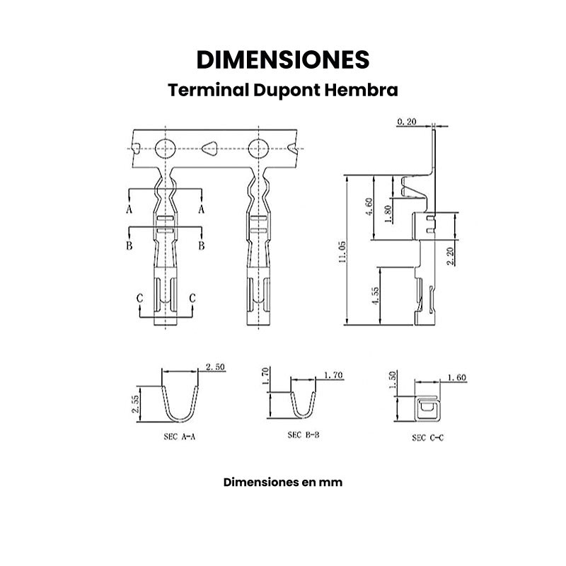 Terminal Dupont hembra o conector Dupont, es una terminal para realizar tus propios cables o armar tu instalación de cables tipo Dupont del tamaño que se ajuste a tu necesidad.