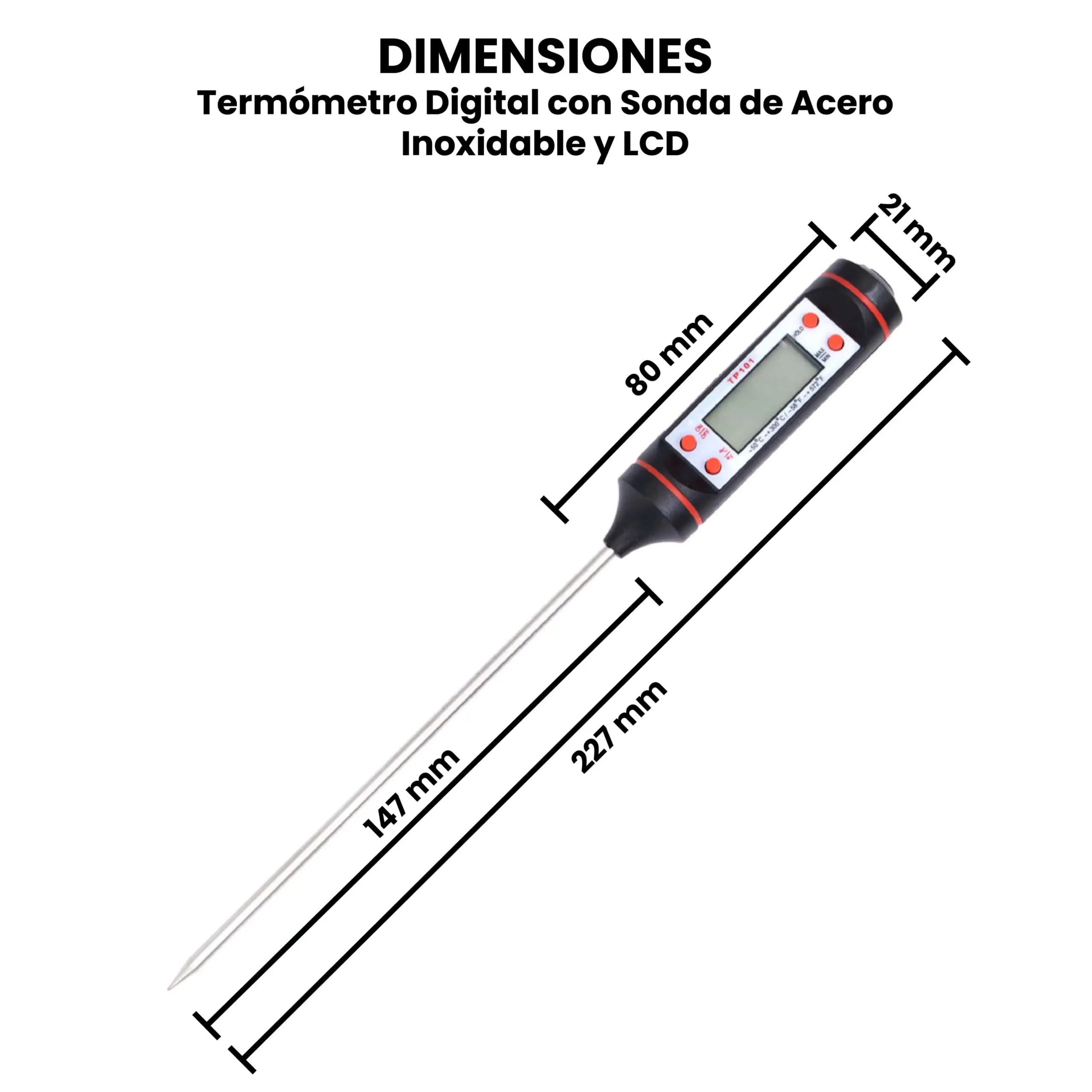 El termómetro digital con sonda de acero inoxidable y pantalla LCD es un instrumento portátil diseñado para medir la temperatura de forma rápida y precisa en sólidos, líquidos y semisólidos. Funciona mediante un sensor térmico ubicado en la punta de la sonda de acero inoxidable, el cual detecta los cambios de temperatura cuando entra en contacto con el objeto o sustancia a medir; esta información se convierte en una señal eléctrica que el circuito interno procesa y muestra en tiempo real en la pantalla LCD en grados Celsius o Fahrenheit.