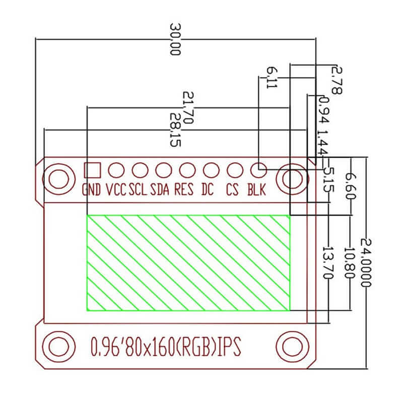 TFT Display LCD 0.96″ ST7735 es una pantalla LCD TFT a color de 0,96 “de 80×160 puntos con controlador ST7735S y tablero de conexiones, calidad de visualización superior, ángulo de visión completo, ángulo de visión súper amplio y fácil de controlar mediante MCU como 8051, PIC, AVR, ARDUINO, ARM y Raspberry PI. El controlador TFT (ST7735R) puede mostrar color completo de 16 bits utilizando el código de la biblioteca Adafruit GFX.