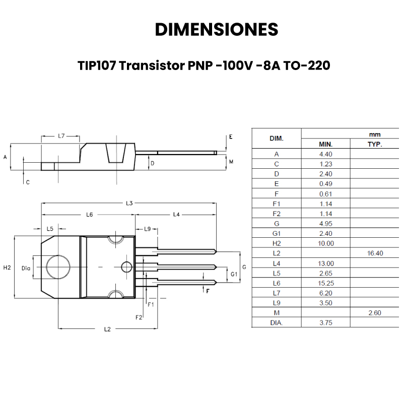 - El TIP107 típicamente se instala en un disipador de calor debido a la disipación de potencia generada durante la operación.