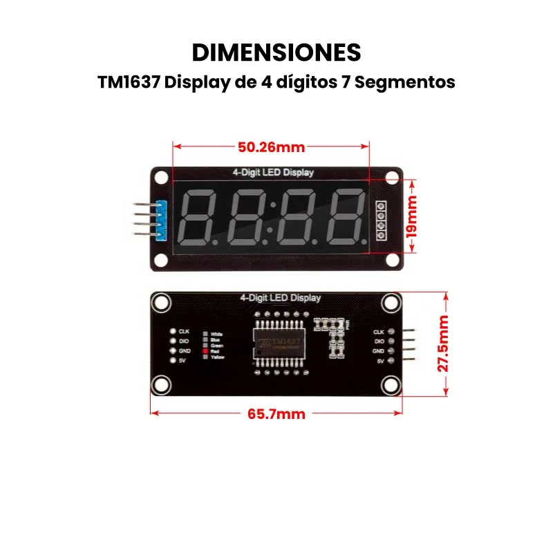 Un display TM1637 es un módulo de visualización de 4 dígitos y 7 segmentos que incluye un chip controlador, lo que permite usar solo dos pines de un microcontrolador (como un Arduino o Raspberry Pi) para mostrar información numérica de forma sencilla. Este display cuenta con punto decimal que permite representar números y letras en proyectos y/o equipos electrónicos. Es ideal para proyectos de electrónica que necesitan mostrar valores numéricos, como relojes, contadores o indicadores de temperatura, y es fácil de programar.
