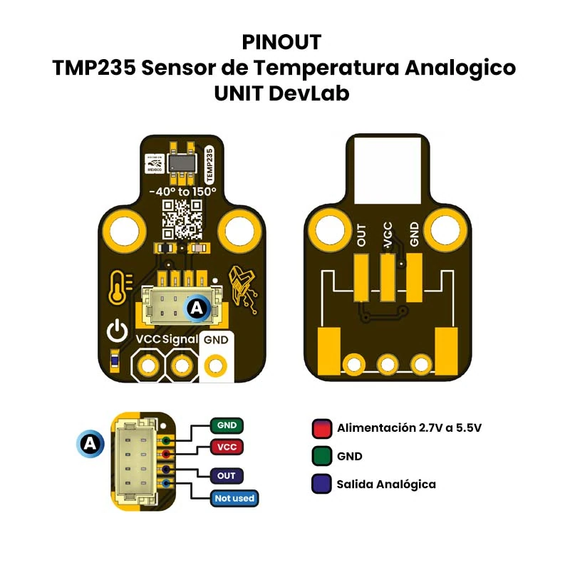 El TMP235 Sensor de Temperatura Analógico es un módulo sensor de temperatura de alta precisión, diseñado para realizar mediciones de temperatura en diversas aplicaciones con una salida lineal de 10 mV por °C por medio de una salida analógica, bajo consumo de energía y un amplio rango de voltaje de operación, lo que lo hace ideal para sistemas embebidos, monitoreo ambiental y proyectos de IoT.