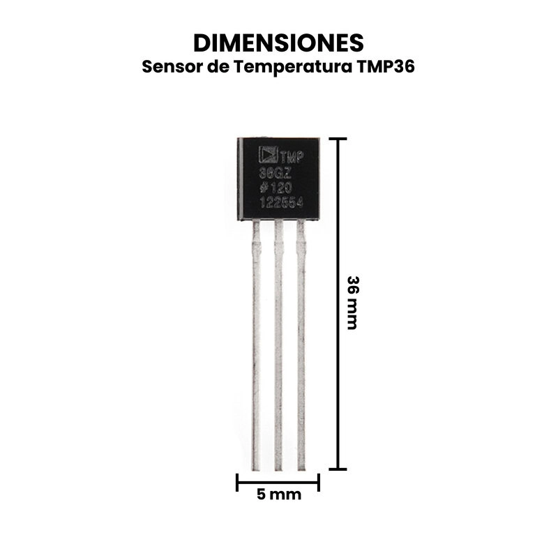 El TMP36 Sensor de Temperatura es un sensor analógico de precisión diseñado para medir temperatura ambiente en un rango amplio, típicamente de -40 °C a +125 °C. Funciona generando una señal de voltaje proporcional a la temperatura que se puede leer directamente con un conversor analógico-digital (ADC) de un microcontrolador. A diferencia de otros sensores, el TMP36 entrega una salida en voltios donde 0.5 V corresponde aproximadamente a 0 °C, y cada incremento de 10 mV representa 1 °C, lo que simplifica el cálculo de la temperatura sin necesidad de calibración externa.