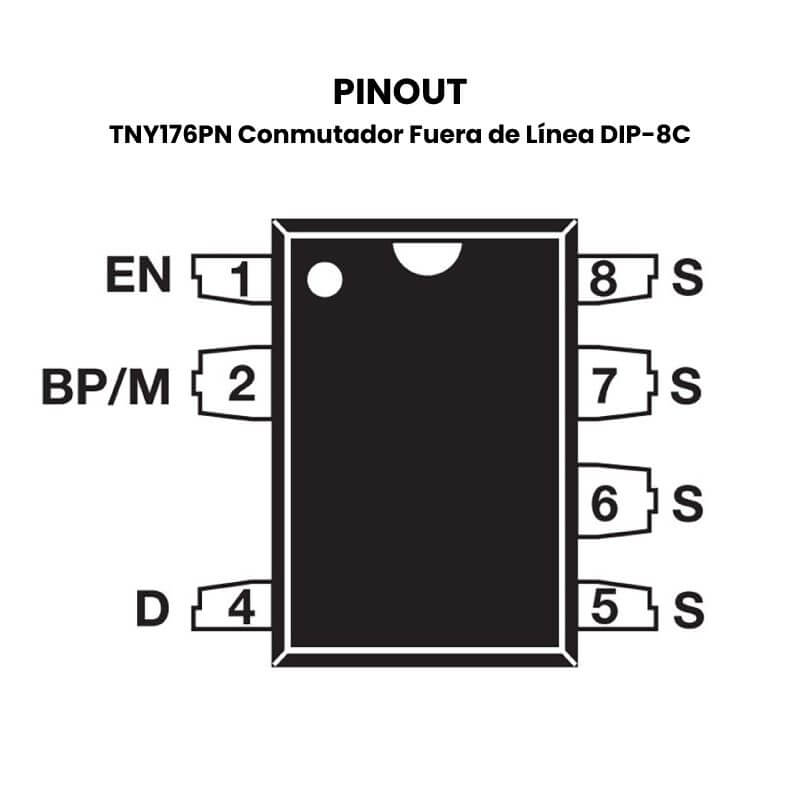 El IC TNY176PN DIP-8C funciona a partir de una entrada de voltaje de CC (corriente continua) y entrega una salida de voltaje regulada y controlada para alimentar los diferentes componentes del sistema. Este dispositivo tiene la capacidad de controlar la frecuencia de conmutación y la duración del pulso para controlar la cantidad de energía entregada.