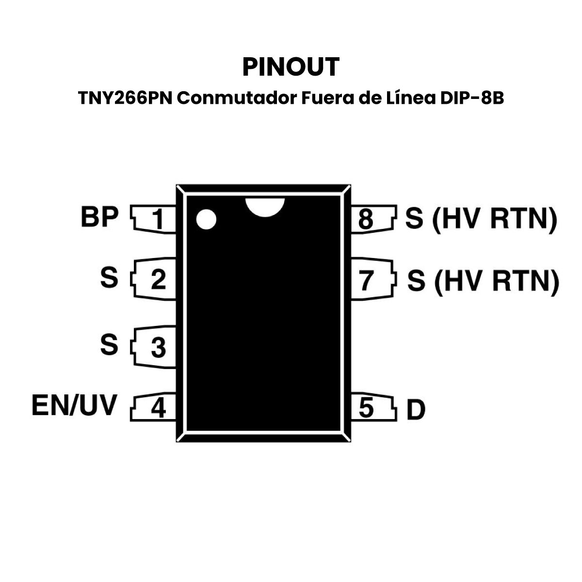 Al igual que el IC TNY176PN DIP-8C, el TNY266PN también tiene un encapsulado DIP-8B con pines curvados para facilitar la soldadura en placas de circuito impreso.