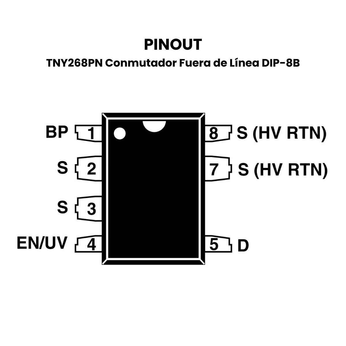 TNY268PN conmutador fuera de línea es un circuito integrado con encapsulado DIP-8B de 7 pines. El TNY268PN es un controlador de fuente de alimentación conmutada (SMPS, por sus siglas en inglés), diseñado para convertir una entrada de voltaje de CA en una salida de voltaje de CC regulada y eficiente en términos energéticos. El circuito integrado utiliza tecnología de conmutación de frecuencia fija para minimizar las pérdidas de energía y maximizar la eficiencia de la fuente de alimentación.