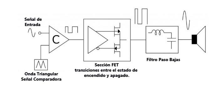Un amplificador clase D convierte la entrada analógica en una forma de onda PWM para activar o desactivar por completo los interruptores con transistor de efecto de campo (FET).