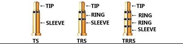 Se le denomina también conector TS (tip-sleeve, punta-funda), de tipo desbalanceado, o conector TRS (tip-ring-sleeve, punta-anillo-funda), de tipo balanceado. Por último, tenemos a los TRRS (Tip-Ring-Ring-Sleeve) cuando tienen un anillo adicional o auxiliar para llevar también señal de micrófono para los auriculares.