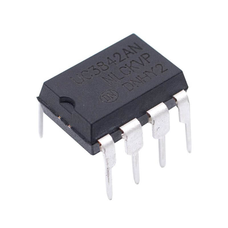 UC3842AN controlador PWM de 30V 1A con ciclo de trabajo del 100% y UVLO de 16V (Encendido) y 10V (Apagado). Este circuito integrado “CI” tiene un encapsulado DIP-8 de montaje superficial, está diseñado para aplicaciones de control de corriente fija de alto rendimiento para convertidores DC a DC y fuera de línea. El UC3842AN cuenta con un oscilador interno que ayuda a tener un control más preciso con el ciclo de trabajo, así como referencia compensada por temperatura, amplificador de error de alta ganancia, un comparador de detección de corriente y una salida de tótem de alta corriente, ideal para impulsar un MOSFET de potencia.