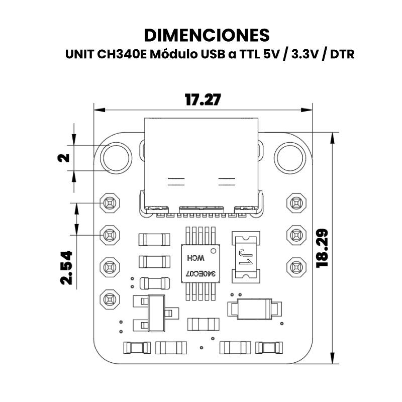 UNIT CH340E cuenta con pines de comunicación UART y señal DTR, así como dos leds indicadores podrás saber cuando el módulo ésta energizado (PWR) o está transmitiendo o recibiendo información (Tx/Rx). Cuenta con una protección a la entrada de 2 A, por lo que la corriente máxima de salida por el pin 5V será de 2 pero esto dependerá de tu puerto USB.
